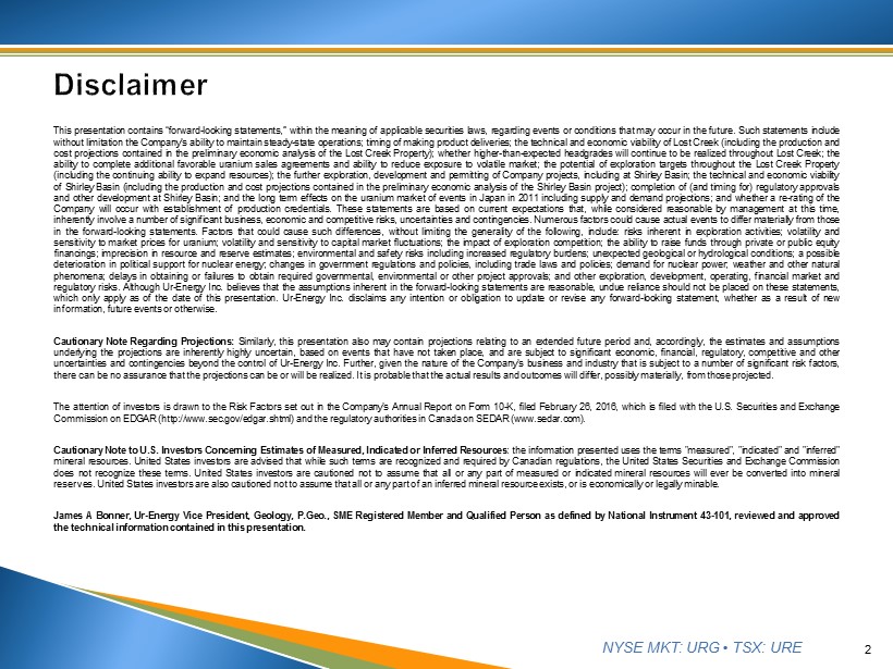 NYSE MKT: URG • TSX: URE This presentation contains “forward - looking statements,” within the meaning of applicable securities laws, regarding events or conditions that may occur in the future . Such statements include without limitation the Company’s ability to maintain steady - state operations ; timing of making product deliveries ; the technical and economic viability of Lost Creek (including the production and cost projections contained in the preliminary economic analysis of the Lost Creek Property) ; whether higher - than - expected headgrades will continue to be realized throughout Lost Creek ; the ability to complete additional favorable uranium sales agreements and ability to reduce exposure to volatile market ; the potential of exploration targets throughout the Lost Creek Property (including the continuing ability to expand resources) ; the further exploration, development and permitting of Company projects, including at Shirley Basin ; the technical and economic viability of Shirley Basin (including the production and cost projections contained in the preliminary economic analysis of the Shirley Basin project) ; completion of (and timing for) regulatory approvals and other development at Shirley Basin ; and the long term effects on the uranium market of events in Japan in 2011 including supply and demand projections ; and whether a re - rating of the Company will occur with establishment of production credentials . These statements are based on current expectations that, while considered reasonable by management at this time, inherently involve a number of significant business, economic and competitive risks, uncertainties and contingencies . Numerous factors could cause actual events to differ materially from those in the forward - looking statements . Factors that could cause such differences, without limiting the generality of the following, include : risks inherent in exploration activities ; volatility and sensitivity to market prices for uranium ; volatility and sensitivity to capital market fluctuations ; the impact of exploration competition ; the ability to raise funds through private or public equity financings ; imprecision in resource and reserve estimates ; environmental and safety risks including increased regulatory burdens ; unexpected geological or hydrological conditions ; a possible deterioration in political support for nuclear energy ; changes in government regulations and policies, including trade laws and policies ; demand for nuclear power ; weather and other natural phenomena ; delays in obtaining or failures to obtain required governmental, environmental or other project approvals ; and other exploration, development, operating, financial market and regulatory risks . Although Ur - Energy Inc . believes that the assumptions inherent in the forward - looking statements are reasonable, undue reliance should not be placed on these statements, which only apply as of the date of this presentation . Ur - Energy Inc . disclaims any intention or obligation to update or revise any forward - looking statement, whether as a result of new information, future events or otherwise . Cautionary Note Regarding Projections : Similarly, t his presentation also may contain projections relating to an extended future period and, accordingly, the estimates and assumptions underlying the projections are inherently highly uncertain, based on events that have not taken place, and are subject to significant economic, financial, regulatory, competitive and other uncertainties and contingencies beyond the control of Ur - Energy Inc . Further, given the nature of the Company's business and industry that is subject to a number of significant risk factors, there can be no assurance that the projections can be or will be realized . It is probable that the actual results and outcomes will differ, possibly materially, from those projected . The attention of investors is drawn to the Risk Factors set out in the Company's Annual Report on Form 10 - K, filed February 26 , 2016 , which is filed with the U . S . Securities and Exchange Commission on EDGAR (http : //www . sec . gov/edgar . shtml) and the regulatory authorities in Canada on SEDAR (www . sedar . com) . Cautionary Note to U . S . Investors Concerning Estimates of Measured, Indicated or Inferred Resources : the information presented uses the terms "measured", "indicated" and "inferred" mineral resources . United States investors are advised that while such terms are recognized and required by Canadian regulations, the United States Securities and Exchange Commission does not recognize these terms . United States investors are cautioned not to assume that all or any part of measured or indicated mineral resources will ever be converted into mineral reserves . United States investors are also cautioned not to assume that all or any part of an inferred mineral resource exists, or is economically or legally minable . James A Bonner, Ur - Energy Vice President, Geology, P . Geo . , SME Registered Member and Qualified Person as defined by National Instrument 43 - 101 , reviewed and approved the technical information contained in this presentation . 2
