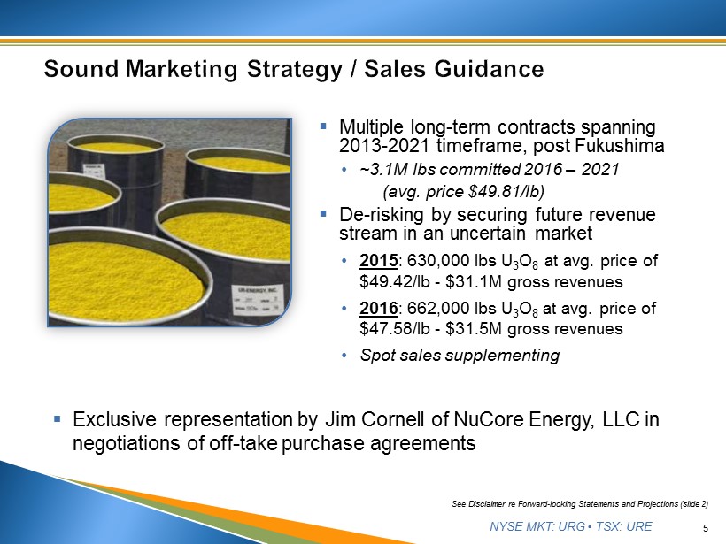 NYSE MKT: URG • TSX: URE 4 Share Capital & Cash Position As of 12/31/2015 Shares Outstanding 130.2M Stock Options & RSUs 11.1M Warrants 8.2M Fully Diluted 149.5M Shares Outstanding (2/25/16) 143.3M Cash (2/25/2016) US$6.8M Market Cap ( 2/29/2016 ) US$63.18M Share Price (2/29/2016) US$0.47 52 Week Range US$0.44 - $1.08 Avg. Daily Volume ~435,000 (3 - mo URG & URE 2/29/2016) Member of S&P/TSX SmallCap Index Geographical Distribution as of 6/30/15 United States ~65% Canada ~19% Other ~16% NYSE MKT: URG TSX: URE