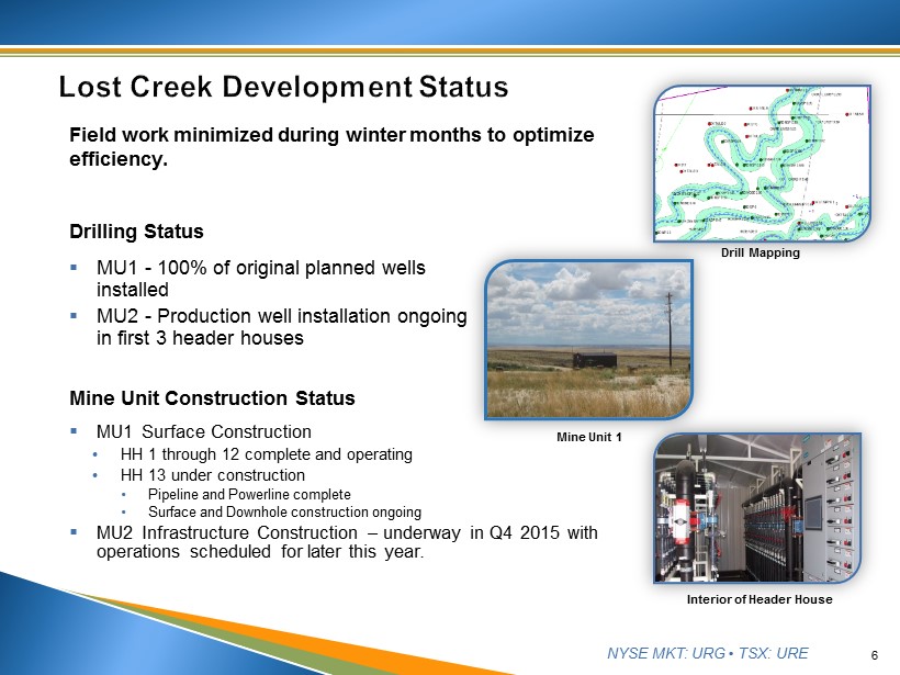 NYSE MKT: URG • TSX: URE ▪ Multiple long - term contracts spanning 2013 - 2021 timeframe, post Fukushima • ~3.1M lbs committed 2016 – 2021 (avg. price $49.81/ lb ) ▪ De - risking by securing future revenue stream in an uncertain market • 2015 : 630,000 lbs U 3 O 8 at avg. price of $49.42/ lb - $31.1M gross revenues • 2016 : 662,000 lbs U 3 O 8 at avg. price of $47.58/ lb - $31.5M gross revenues • Spot sales supplementing 5 ▪ Exclusive representation by Jim Cornell of NuCore Energy, LLC in negotiations of off - take purchase agreements See Disclaimer re Forward - looking Statements and Projections (slide 2)