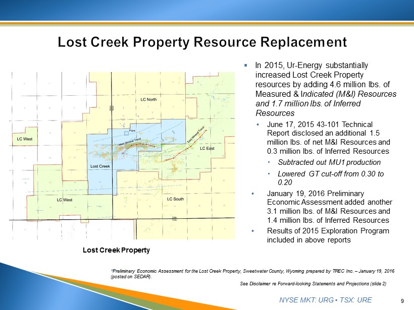 NYSE MKT: URG • TSX: URE 8 2013 2014 2015 Lbs U 3 O 8 Captured 190K 596K 784K Lbs U 3 O 8 Drummed 131K 548K 727K Cash Cost* $21.98/ lb $19.73/ lb $16.27/ lb Production 2013 2014 2015 Revenues ( U 3 O 8 ) $5.7 million $26.5 million $41.8 million Sales 90K lbs at $62.92/ lb 518K lbs at $51.22/ lb 925K lbs at $45.20/ lb Revenues * Excludes severance and ad valorem taxes, which for 2015 averaged $3.14 per pound