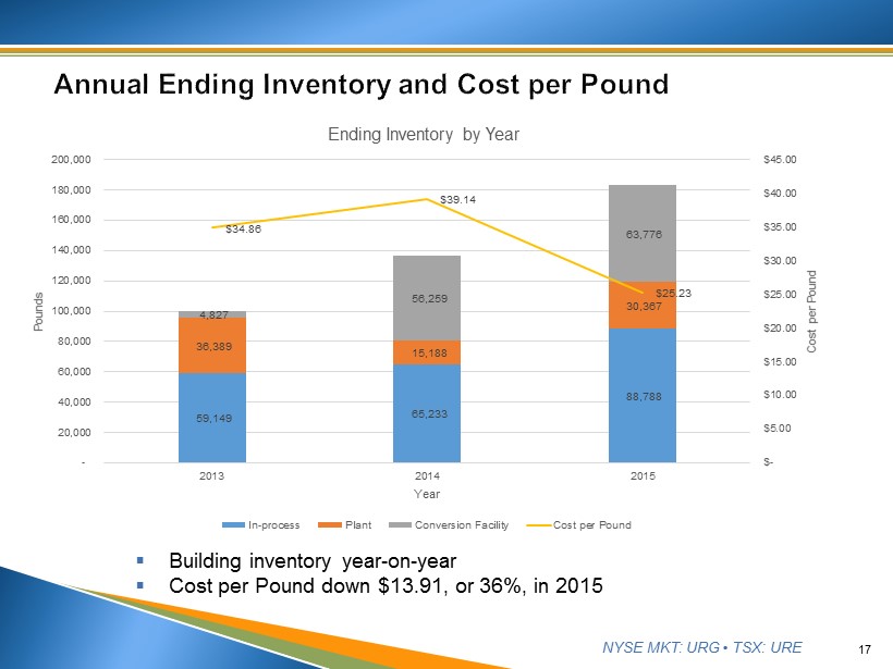 NYSE MKT: URG • TSX: URE 16 Increasing operational efficiencies (steady state) permits ▪ B uilding inventory ▪ D iscretionary spot sales ▪ Low cash cost per pound in ending inventory (Q4 $15.39 vs. Q3 $16.50) 65,233 79,284 79,036 71,860 88,788 15,188 25,819 30,006 22,455 30,367 56,259 82,021 66,314 102,782 63,776 $39.14 $31.37 $27.37 $29.43 $25.23 $- $5.00 $10.00 $15.00 $20.00 $25.00 $30.00 $35.00 $40.00 $45.00 - 50,000 100,000 150,000 200,000 250,000 2014 Q4 2015 Q1 2015 Q2 2015 Q3 2015 Q4 Cost per Pound Pounds Quarter Ending Inventory by Quarter In-process Plant Conversion Facility Cost per Pound