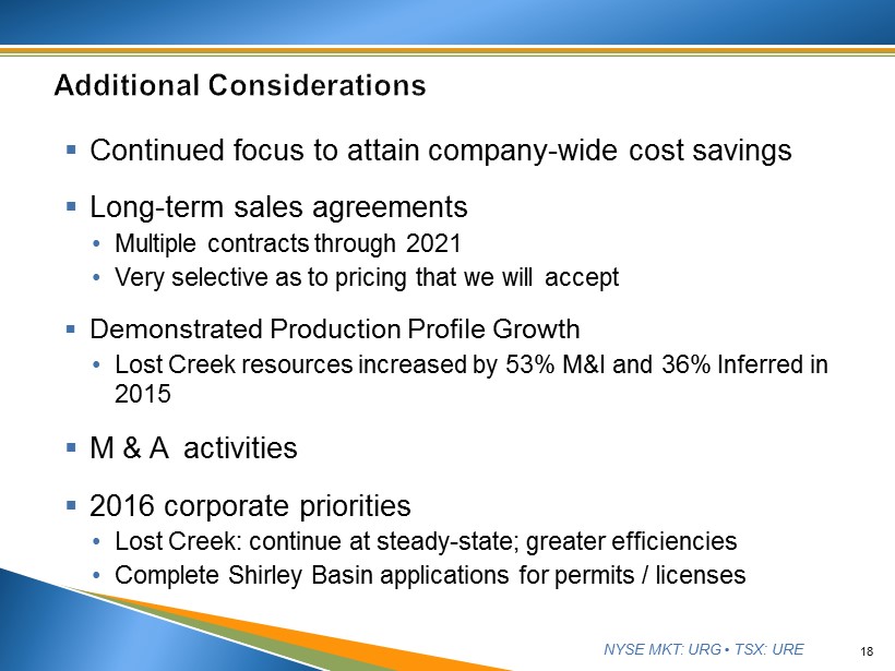 NYSE MKT: URG • TSX: URE 17 ▪ Building inventory year - on - year ▪ Cost per Pound down $13.91, or 36%, in 2015 59,149 65,233 88,788 36,389 15,188 30,367 4,827 56,259 63,776 $34.86 $39.14 $25.23 $- $5.00 $10.00 $15.00 $20.00 $25.00 $30.00 $35.00 $40.00 $45.00 - 20,000 40,000 60,000 80,000 100,000 120,000 140,000 160,000 180,000 200,000 2013 2014 2015 Cost per Pound Pounds Year Ending Inventory by Year In-process Plant Conversion Facility Cost per Pound