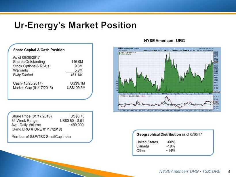 NYSE American: URG • TSX: URE ▪ U.S. demand is not met by U.S. production • U.S. domestic production ~1.5M lbs of uranium/ yr • U.S. utilities consume ~46.5M lbs of uranium/ yr ▪ Ur - Energy is well positioned to capitalize on this opportunity 4 See Disclaimer re Forward - looking Statements and Projections (slide 2) Source: Industry guidance; US EIA Information 2016 - 17 Uranium originating in Kazakhstan, Russia and Uzbekistan accounted for 38% of the 51 million pounds purchased by U.S. utilities