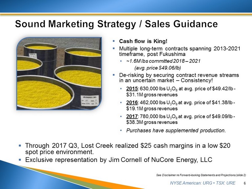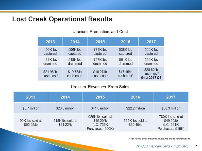 NYSE American: URG • TSX: URE ▪ Cash flow is King! ▪ Multiple long - term contracts spanning 2013 - 2021 timeframe, post Fukushima • ~1.6M lbs committed 2018 – 2021 (avg. price $49.06/ lb ) ▪ De - risking by securing contract revenue streams in an uncertain market – Consistency! • 2015 : 630,000 lbs U 3 O 8 at avg. price of $49.42/ lb - $31.1M gross revenues • 2016 : 462,000 lbs U 3 O 8 at avg. price of $41.38/ lb - $19.1M gross revenues • 2017 : 780,000 lbs U 3 O 8 at avg. price of $49.09/ lb - $38.3M gross revenues • Purchases have supplemented production. 6 ▪ Through 2017 Q3, Lost Creek realized $25 cash margins in a low $20 spot price environment. ▪ Exclusive representation by Jim Cornell of NuCore Energy, LLC See Disclaimer re Forward - looking Statements and Projections (slide 2)