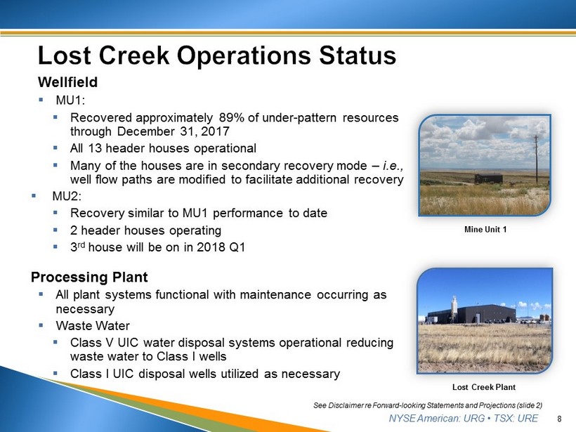 NYSE American: URG • TSX: URE 7 2013 2014 2015 2016 2017 190K lbs captured 596K lbs captured 784K lbs captured 538K lbs captured 265K lbs captured 131K lbs drummed 548K lbs drummed 727K lbs drummed 561K lbs drummed 254K lbs drummed $21.98/lb cash cost* $19.73/ lb cash cost* $16.27/ lb cash cost* $17.15/ lb cash cost* $28.82/ lb cash cost* thru 2017 Q3 Uranium Production and Cost 2013 2014 2015 2016 2017 $5.7 million $26.5 million $41.8 million $22.2 million $38.3 million 90K lbs sold at $62.92/ lb 518K lbs sold at $51.22/ lb 925K lbs sold at $45.20/ lb (LC: 725K Purchases: 200K) 562K lbs sold at $39.49/ lb 780K lbs sold at $49.09/ lb (LC: 261K Purchases: 519K) Uranium Revenues From Sales * Per Pound Sold, excludes severance and ad valorem taxes