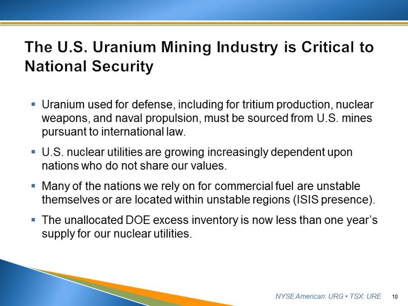 NYSE American: URG • TSX: URE 9 ▪ U.S. Uranium Market is at Risk from Foreign Imports • Russia, Kazakhstan and Uzbekistan now fulfill nearly 40% of U.S. demand, while domestic production fulfills less than 5% • In 2017, U.S. uranium production fell to historic lows and continues to decline ▪ Foreign Uranium Imports Threaten U.S. National Security • U.S. uranium industry is vital to national security Required for U.S. defense programs Supplies fuel for nuclear power plants – 20% of U.S. electric grid See Disclaimer re Forward - looking Statements and Projections (slide 2)