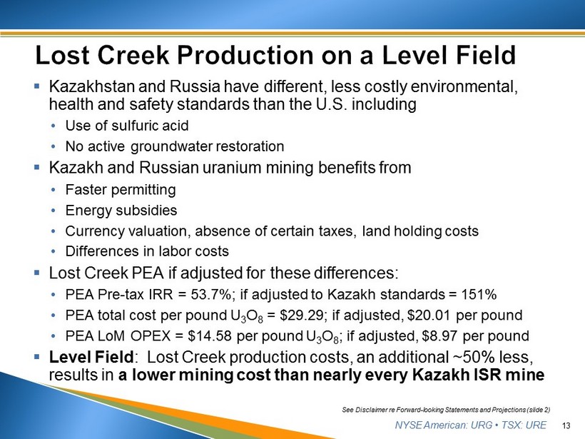 NYSE American: URG • TSX: URE ▪ Kazakhstan and Russia have different, less costly environmental, health and safety standards than the U.S. including • Use of sulfuric acid • No active groundwater restoration ▪ Kazakh and Russian uranium mining benefits from • Faster permitting • Energy subsidies • Currency valuation, absence of certain taxes, land holding costs • Differences in labor costs ▪ Lost Creek PEA if adjusted for these differences: • PEA Pre - tax IRR = 53.7%; if adjusted to Kazakh standards = 151% • PEA total cost per pound U 3 O 8 = $29.29; if adjusted, $20.01 per pound • PEA LoM OPEX = $14.58 per pound U 3 O 8 ; if adjusted, $8.97 per pound ▪ Level Field : Lost Creek production costs, an additional ~50% less, results in a lower mining cost than nearly every Kazakh ISR mine 13 See Disclaimer re Forward - looking Statements and Projections (slide 2)