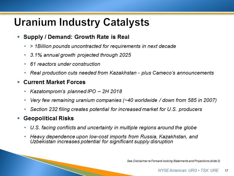NYSE American: URG • TSX: URE • Lowest - cost producer among all publicly - traded companies • Results delivered since Fukushima • Term contracts de - risk Company and protect our shareholders • Section 232 filing serves national security, while seeking remedies to sustain domestic uranium industry • Evolved strategy – proper balance between produced and purchased pounds Best cash margins in the industry: ~$25/ lb thru 2017 Q3 • Cash flow is King: Either you are cash flowing or you are diluting. There is no third option. 16 See Disclaimer re Forward - looking Statements and Projections (slide 2)