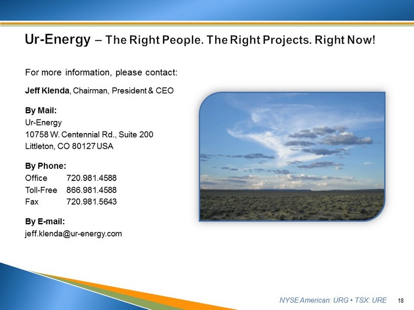 NYSE American: URG • TSX: URE For more information, please contact: Jeff Klenda , Chairman, President & CEO By Mail: Ur - Energy 10758 W. Centennial Rd., Suite 200 Littleton, CO 80127 USA By Phone: Office 720.981.4588 Toll - Free 866.981.4588 Fax 720.981.5643 By E - mail: jeff.klenda@ur - energy.com 18