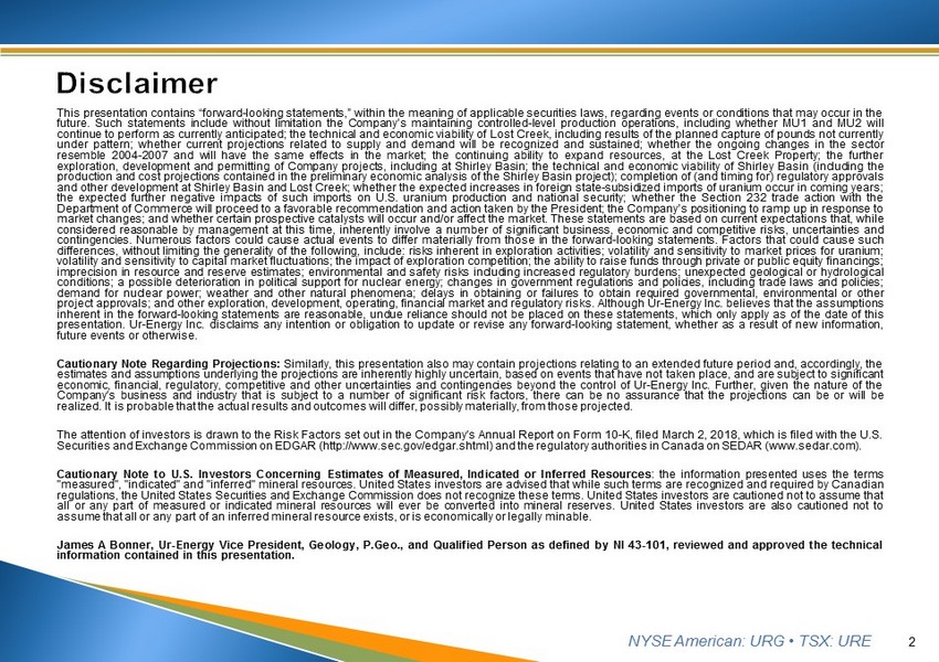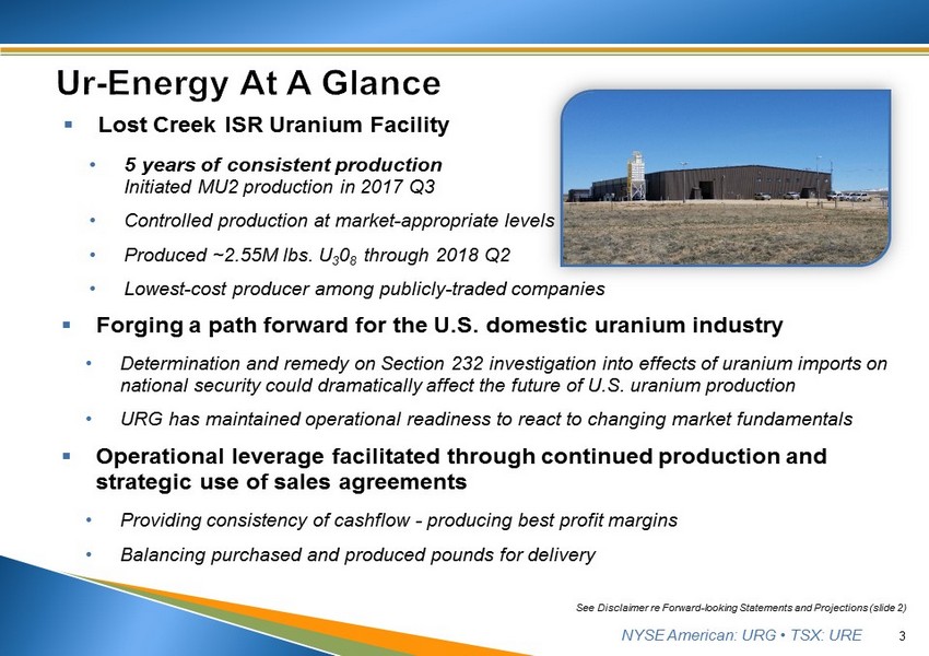 NYSE American: URG • TSX: URE This presentation contains “forward - looking statements,” within the meaning of applicable securities laws, regarding events or conditions that may occur in the future . Such statements include without limitation the Company’s maintaining controlled - level production operations, including whether MU 1 and MU 2 will continue to perform as currently anticipated ; the technical and economic viability of Lost Creek, including results of the planned capture of pounds not currently under pattern ; w hether current projections related to supply and demand will be recognized and sustained ; whether the ongoing changes in the sector resemble 2004 - 2007 and will have the same effects in the market ; the continuing ability to expand resources, at the Lost Creek Property ; the further exploration, development and permitting of Company projects, including at Shirley Basin ; the technical and economic viability of Shirley Basin (including the production and cost projections contained in the preliminary economic analysis of the Shirley Basin project) ; completion of (and timing for) regulatory approvals and other development at Shirley Basin and Lost Creek ; whether the expected increases in foreign state - subsidized imports of uranium occur in coming years ; the expected further negative impacts of such imports on U . S . uranium production and national security ; whether the Section 232 trade action with the Department of Commerce will proceed to a favorable recommendation and action taken by the President ; the Company’s positioning to ramp up in response to market changes ; and whether certain prospective catalysts will occur and/or affect the market . These statements are based on current expectations that, while considered reasonable by management at this time, inherently involve a number of significant business, economic and competitive risks, uncertainties and contingencies . Numerous factors could cause actual events to differ materially from those in the forward - looking statements . Factors that could cause such differences, without limiting the generality of the following, include : risks inherent in exploration activities ; volatility and sensitivity to market prices for uranium ; volatility and sensitivity to capital market fluctuations ; the impact of exploration competition ; the ability to raise funds through private or public equity financings ; imprecision in resource and reserve estimates ; environmental and safety risks including increased regulatory burdens ; unexpected geological or hydrological conditions ; a possible deterioration in political support for nuclear energy ; changes in government regulations and policies, including trade laws and policies ; demand for nuclear power ; weather and other natural phenomena ; delays in obtaining or failures to obtain required governmental, environmental or other project approvals ; and other exploration, development, operating, financial market and regulatory risks . Although Ur - Energy Inc . believes that the assumptions inherent in the forward - looking statements are reasonable, undue reliance should not be placed on these statements, which only apply as of the date of this presentation . Ur - Energy Inc . disclaims any intention or obligation to update or revise any forward - looking statement, whether as a result of new information, future events or otherwise . Cautionary Note Regarding Projections : Similarly, t his presentation also may contain projections relating to an extended future period and, accordingly, the estimates and assumptions underlying the projections are inherently highly uncertain, based on events that have not taken place, and are subject to significant economic, financial, regulatory, competitive and other uncertainties and contingencies beyond the control of Ur - Energy Inc . Further, given the nature of the Company's business and industry that is subject to a number of significant risk factors, there can be no assurance that the projections can be or will be realized . It is probable that the actual results and outcomes will differ, possibly materially, from those projected . The attention of investors is drawn to the Risk Factors set out in the Company's Annual Report on Form 10 - K, filed March 2 , 2018 , which is filed with the U . S . Securities and Exchange Commission on EDGAR (http : //www . sec . gov/edgar . shtml) and the regulatory authorities in Canada on SEDAR (www . sedar . com) . Cautionary Note to U . S . Investors Concerning Estimates of Measured, Indicated or Inferred Resources : the information presented uses the terms "measured", "indicated" and "inferred" mineral resources . United States investors are advised that while such terms are recognized and required by Canadian regulations, the United States Securities and Exchange Commission does not recognize these terms . United States investors are cautioned not to assume that all or any part of measured or indicated mineral resources will ever be converted into mineral reserves . United States investors are also cautioned not to assume that all or any part of an inferred mineral resource exists, or is economically or legally minable . James A Bonner, Ur - Energy Vice President, Geology, P . Geo . , and Qualified Person as defined by NI 43 - 101 , reviewed and approved the technical information contained in this presentation . 2