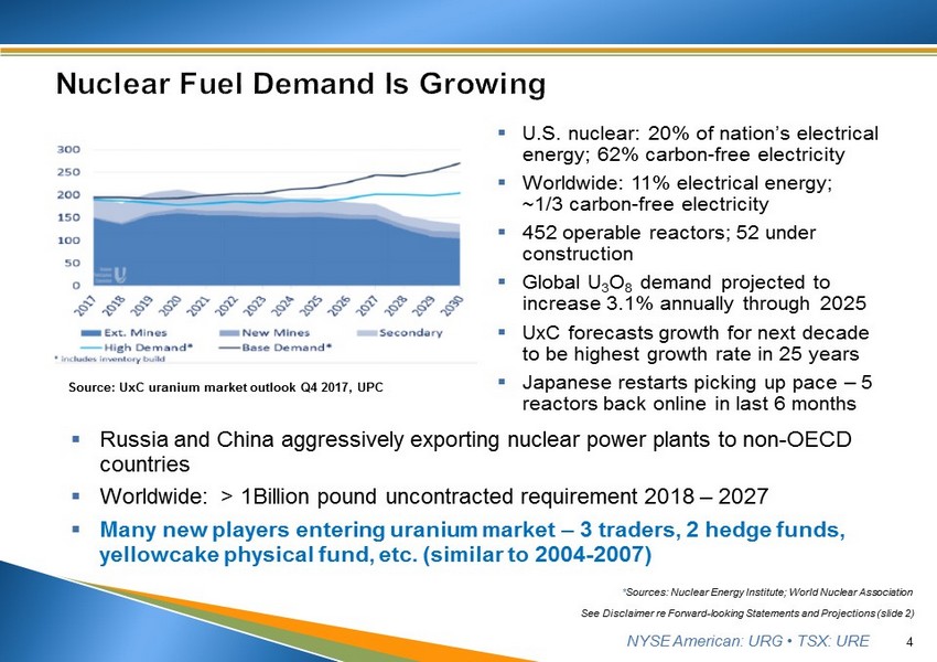 NYSE American: URG • TSX: URE 3 See Disclaimer re Forward - looking Statements and Projections (slide 2) ▪ Lost Creek ISR Uranium Facility • 5 years of consistent production Initiated MU2 production in 2017 Q3 • Controlled production at market - appropriate levels • Produced ~2.55M lbs. U 3 0 8 through 2018 Q2 • Lowest - cost producer among publicly - traded companies ▪ Forging a path forward for the U.S. domestic uranium industry • Determination and remedy on Section 232 investigation into effects of uranium imports on national security could dramatically affect the future of U.S. uranium production • URG has maintained operational readiness to react to changing market fundamentals ▪ Operational leverage facilitated through continued production and strategic use of sales agreements • Providing consistency of cashflow - producing best profit margins • Balancing purchased and produced pounds for delivery