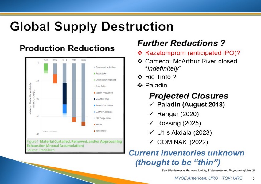 NYSE American: URG • TSX: URE ▪ U.S. nuclear: 20% of nation’s electrical energy; 62% carbon - free electricity ▪ Worldwide: 11% electrical energy; ~1/3 carbon - free electricity ▪ 452 operable reactors; 52 under construction ▪ Global U 3 O 8 demand projected to increase 3.1% annually through 2025 ▪ UxC forecasts growth for next decade to be highest growth rate in 25 years ▪ Japanese restarts picking up pace – 5 reactors back online in last 6 months 4 Source: UxC uranium market outlook Q4 2017, UPC See Disclaimer re Forward - looking Statements and Projections (slide 2) * Sources: Nuclear Energy Institute; World Nuclear Association ▪ Russia and China aggressively exporting nuclear power plants to non - OECD countries ▪ Worldwide: > 1Billion pound uncontracted requirement 2018 – 2027 ▪ Many new players entering uranium market – 3 traders, 2 hedge funds, yellowcake physical fund, etc. (similar to 2004 - 2007)