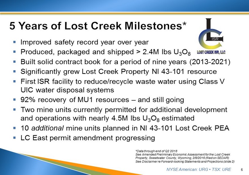 NYSE American: URG • TSX: URE Five Years at Lost Creek Ur - Energy Webcast August 7, 2018