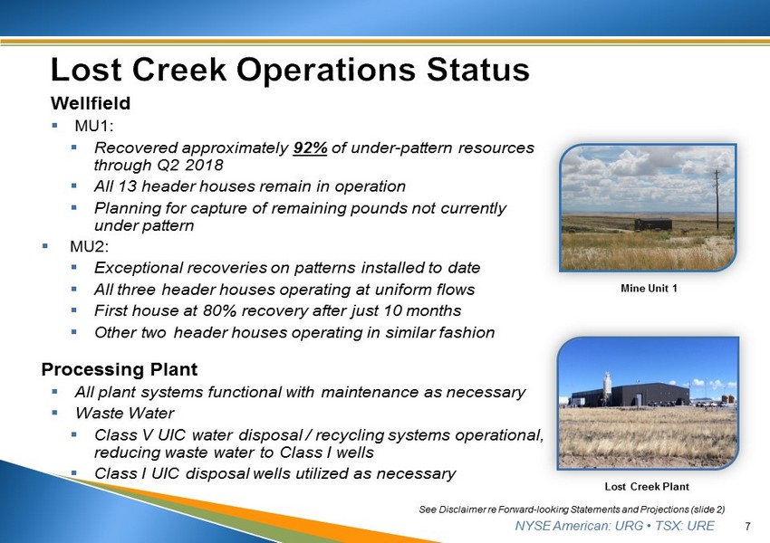 NYSE American: URG • TSX: URE 6 ▪ Improved safety record year over year ▪ Produced, packaged and shipped > 2.4M lbs U 3 O 8 ▪ Built solid contract book for a period of nine years (2013 - 2021) ▪ Significantly grew Lost Creek Property NI 43 - 101 resource ▪ First ISR facility to reduce/recycle waste water using Class V UIC water disposal systems ▪ 92% recovery of MU1 resources – and still going ▪ Two mine units currently permitted for additional development and operations with nearly 4.5M lbs U 3 O 8 estimated ▪ 10 additional mine units planned in NI 43 - 101 Lost Creek PEA ▪ LC East permit amendment progressing *Data through end of Q2 2018 See Amended Preliminary Economic Assessment for the Lost Creek Property, Sweetwater County, Wyoming, 2/8/2016 (filed on SEDAR) See Disclaimer re Forward - looking Statements and Projections (slide 2)