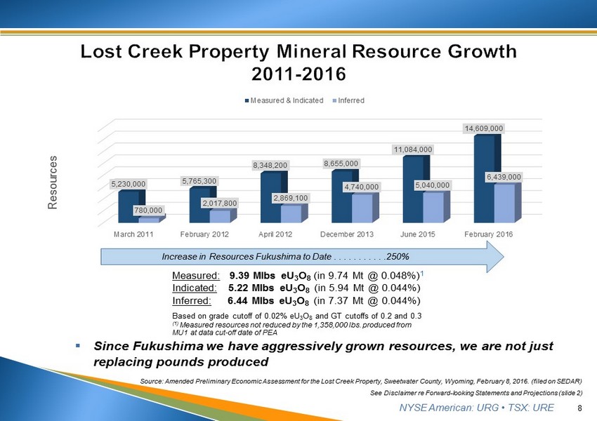 NYSE American: URG • TSX: URE 7 Wellfield ▪ MU1: ▪ Recovered approximately 92% of under - pattern resources through Q2 2018 ▪ All 13 header houses remain in operation ▪ Planning for capture of remaining pounds not currently under pattern ▪ MU2: ▪ Exceptional recoveries on patterns installed to date ▪ All three header houses operating at uniform flows ▪ First house at 80% recovery after just 10 months ▪ Other two header houses operating in similar fashion Processing Plant ▪ All plant systems functional with maintenance as necessary ▪ Waste Water ▪ Class V UIC water disposal / recycling systems operational, reducing waste water to Class I wells ▪ Class I UIC disposal wells utilized as necessary Lost Creek Plant Mine Unit 1 See Disclaimer re Forward - looking Statements and Projections (slide 2)
