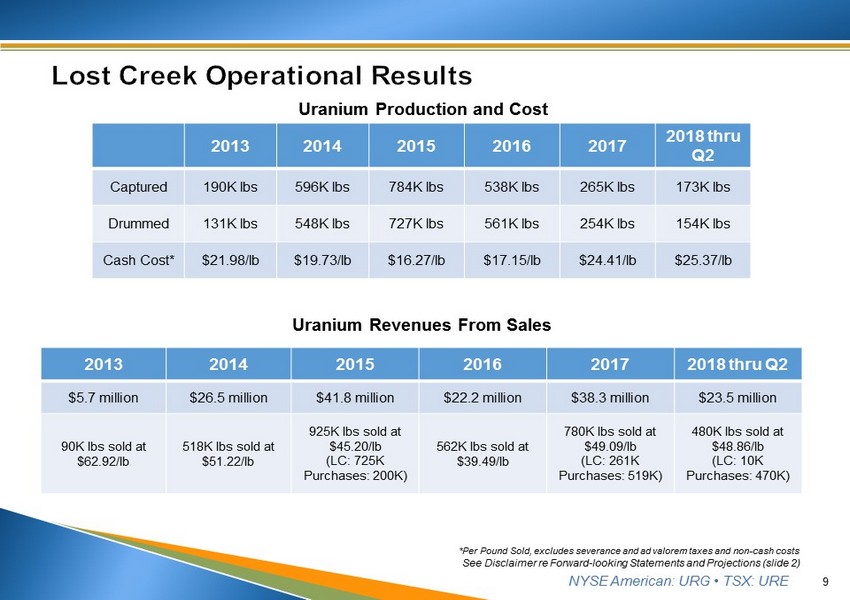 NYSE American: URG • TSX: URE 8 See Disclaimer re Forward - looking Statements and Projections (slide 2) Measured: 9.39 Mlbs eU 3 O 8 (in 9.74 Mt @ 0.048%) 1 Indicated: 5.22 Mlbs eU 3 O 8 (in 5.94 Mt @ 0.044%) Inferred: 6.44 Mlbs eU 3 O 8 (in 7.37 Mt @ 0.044%) Based on grade cutoff of 0.02% eU 3 O 8 and GT cutoffs of 0.2 and 0.3 (1) Measured resources not reduced by the 1,358,000 lbs. produced from MU1 at data cut - off date of PEA Source: Amended Preliminary Economic Assessment for the Lost Creek Property, Sweetwater County, Wyoming, February 8, 2016. (f ile d on SEDAR) Increase in Resources Fukushima to Date . . . . . . . . . . . 250 % March 2011 February 2012 April 2012 December 2013 June 2015 February 2016 5,230,000 5,765,300 8,348,200 8,655,000 11,084,000 14,609,000 780,000 2,017,800 2,869,100 4,740,000 5,040,000 6,439,000 Resources Measured & Indicated Inferred ▪ Since Fukushima we have aggressively grown resources, we are not just replacing pounds produced