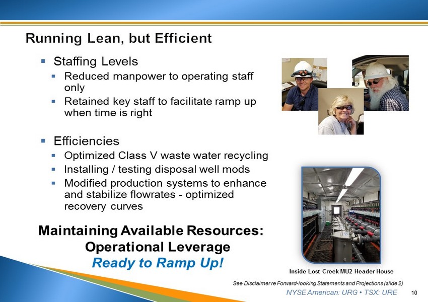 NYSE American: URG • TSX: URE 9 2013 2014 2015 2016 2017 2018 thru Q2 Captured 190K lbs 596K lbs 784K lbs 538K lbs 265K lbs 173K lbs Drummed 131K lbs 548K lbs 727K lbs 561K lbs 254K lbs 154K lbs Cash Cost* $21.98/lb $19.73/lb $16.27/lb $17.15/lb $24.41/lb $25.37/lb Uranium Production and Cost 2013 2014 2015 2016 2017 2018 thru Q2 $5.7 million $26.5 million $41.8 million $22.2 million $38.3 million $23.5 million 90K lbs sold at $62.92/lb 518K lbs sold at $51.22/lb 925K lbs sold at $45.20/lb (LC: 725K Purchases: 200K) 562K lbs sold at $39.49/lb 780K lbs sold at $49.09/lb (LC: 261K Purchases: 519K) 480K lbs sold at $48.86/lb (LC: 10K Purchases: 470K) Uranium Revenues From Sales *Per Pound Sold, excludes severance and ad valorem taxes and non - cash costs See Disclaimer re Forward - looking Statements and Projections (slide 2)