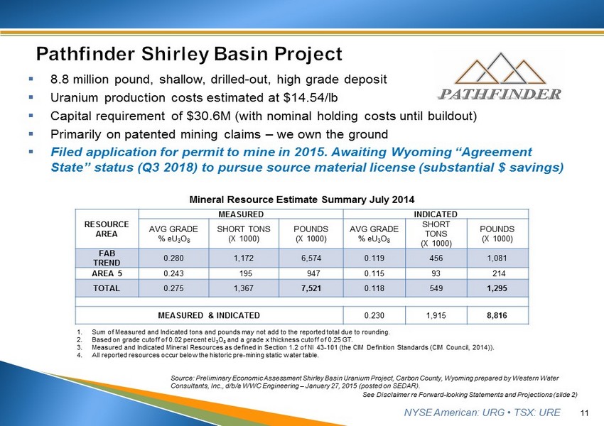 NYSE American: URG • TSX: URE 10 ▪ Staffing Levels ▪ Reduced manpower to operating staff only ▪ Retained key staff to facilitate ramp up when time is right ▪ Efficiencies ▪ Optimized Class V waste water recycling ▪ Installing / testing disposal well mods ▪ Modified production systems to enhance and stabilize flowrates - optimized recovery curves Inside Lost Creek MU2 Header House Maintaining Available Resources: Operational Leverage Ready to Ramp Up! See Disclaimer re Forward - looking Statements and Projections (slide 2)