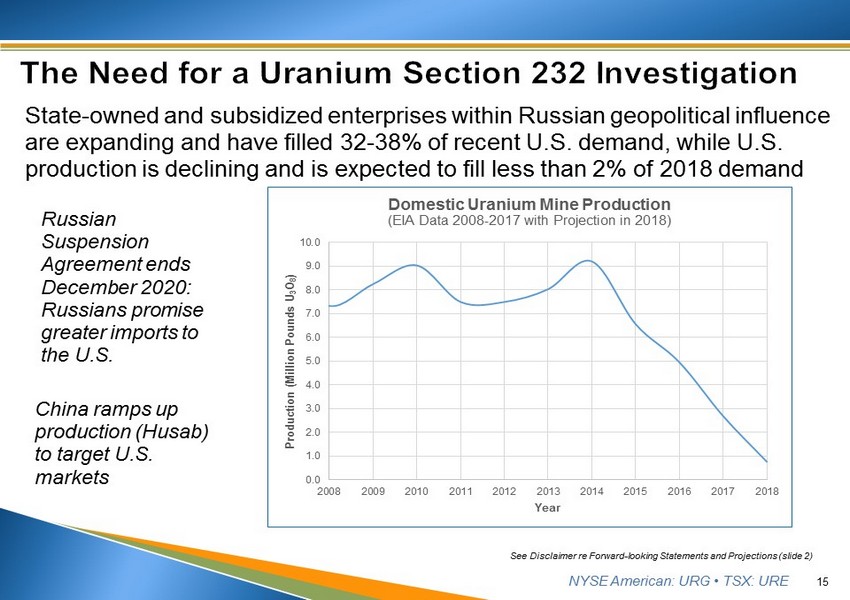 NYSE American: URG • TSX: URE ▪ U.S. demand is dependent on foreign imports Imports of 50MLbs annually for seven of last eight years • U.S. domestic production ~1.2M lbs U3O8, 2017 – 55% less than 2016 ▪ Ur - Energy is well positioned to capitalize on this opportunity 14 See Disclaimer re Forward - looking Statements and Projections (slide 2) Source: Industry guidance; U.S. EIA Information 2017 Cheap Russian, Kazakh, and Uzbek imports only possible because of state - subsidies, devalued currency and lax environmental constraints