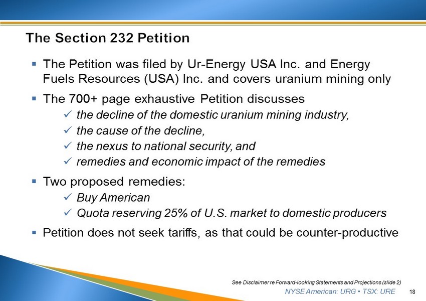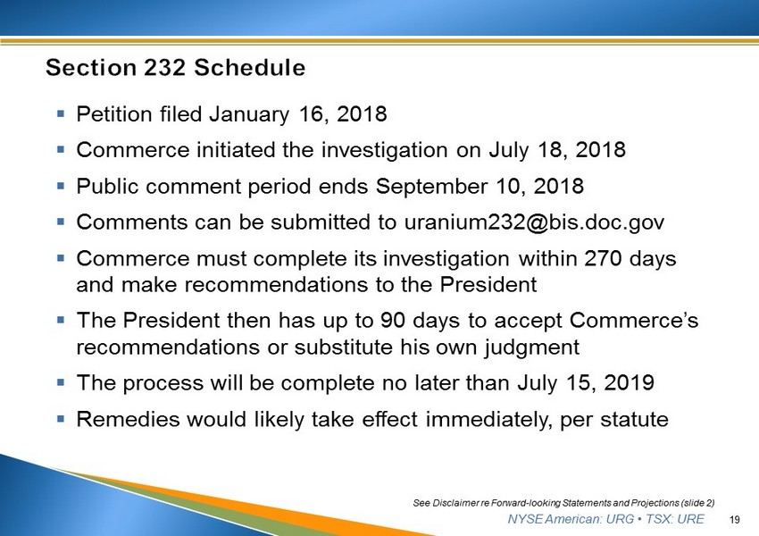 NYSE American: URG • TSX: URE ▪ The Petition was filed by Ur - Energy USA Inc. and Energy Fuels Resources (USA) Inc. and covers uranium mining only ▪ The 700+ page exhaustive Petition discusses x the decline of the domestic uranium mining industry, x the cause of the decline, x the nexus to national security, and x remedies and economic impact of the remedies ▪ Two proposed remedies: x Buy American x Quota reserving 25% of U.S. market to domestic producers ▪ Petition does not seek tariffs, as that could be counter - productive 18 See Disclaimer re Forward - looking Statements and Projections (slide 2)