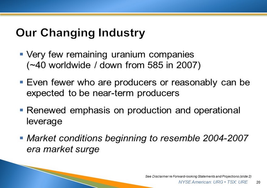 NYSE American: URG • TSX: URE ▪ Petition filed January 16, 2018 ▪ Commerce initiated the investigation on July 18, 2018 ▪ Public comment period ends September 10, 2018 ▪ Comments can be submitted to uranium232@bis.doc.gov ▪ Commerce must complete its investigation within 270 days and make recommendations to the President ▪ The President then has up to 90 days to accept Commerce’s recommendations or substitute his own judgment ▪ The process will be complete no later than July 15, 2019 ▪ Remedies would likely take effect immediately, per statute 19 See Disclaimer re Forward - looking Statements and Projections (slide 2)