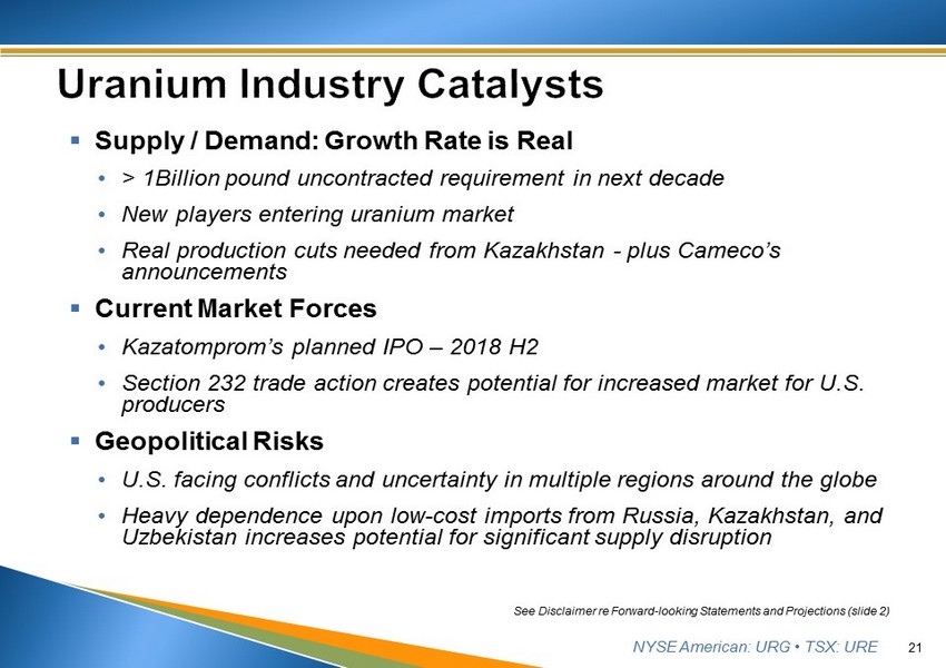 NYSE American: URG • TSX: URE ▪ Very few remaining uranium companies (~40 worldwide / down from 585 in 2007) ▪ Even fewer who are producers or reasonably can be expected to be near - term producers ▪ Renewed emphasis on production and operational leverage ▪ Market conditions beginning to resemble 2004 - 2007 era market surge 20 See Disclaimer re Forward - looking Statements and Projections (slide 2)