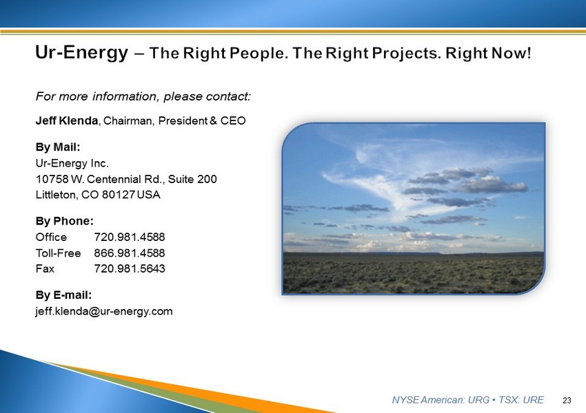 NYSE American: URG • TSX: URE For more information, please contact: Jeff Klenda , Chairman, President & CEO By Mail: Ur - Energy Inc. 10758 W. Centennial Rd., Suite 200 Littleton, CO 80127 USA By Phone: Office 720.981.4588 Toll - Free 866.981.4588 Fax 720.981.5643 By E - mail: jeff.klenda@ur - energy.com 23