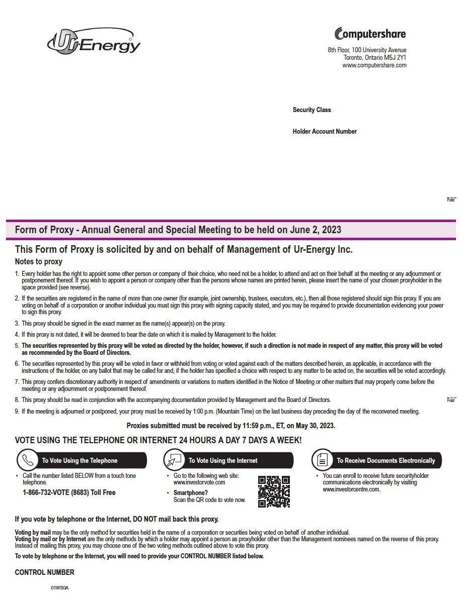 Important Notice Regarding Availability of Proxy Materials for the 2023 Annual and Special Meeting of Shareholders: The attached Management Proxy Circular, proxy card or voter information form, and the Company’s Annual Report to Shareholders (including financial statements) for the fiscal year ended December 31, 2022 are available at www.envisionreports.com/URGQ2023 or can be found at https://www.ur-energy.com.