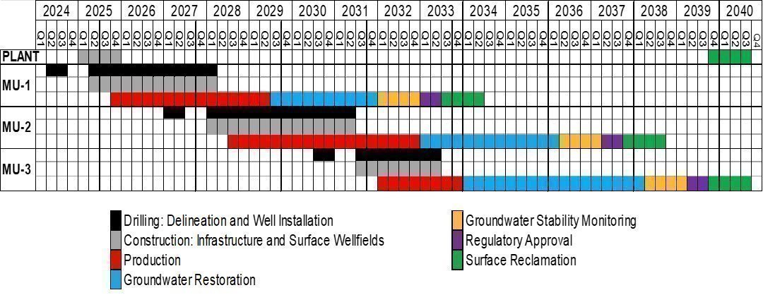 URE should continue with its work on advancing the project toward construction of facilities and installation of wellfields. The pre-mining development and capital costs to construct facilities and install wellfields, included in Table 15, are estimated to be $40.7 million. For the purpose of the economic analysis included in this Report, these activities and related costs are assumed to occur in 2024, 2025 and 2026. The costs for construction design and management are included in this amount.